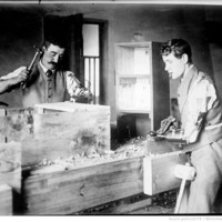 - Dois amputados ingleses, adaptados às suas próteses, realizam trabalhos de carpintaria.